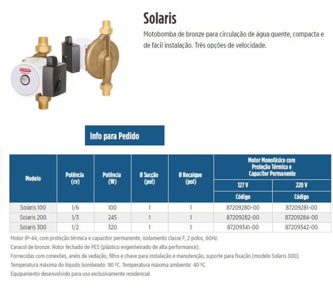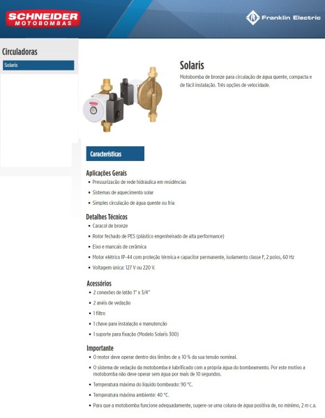 As Motobombas Circuladoras da Franklin são soluções ideais para sistemas de aquecimento de água. Podem ser utilizadas para simples pressurização doméstica e circulação de água quente ou fria. São motobombas compactas, silenciosas e de fácil manuseio. Possuem motor com proteção térmica e capacitor permanente. Conheça a Série Solaris, ideal para sistemas de aquecimento solar e a Série BPR, também utilizada em sistemas de aquecimento a gás e elétrico.