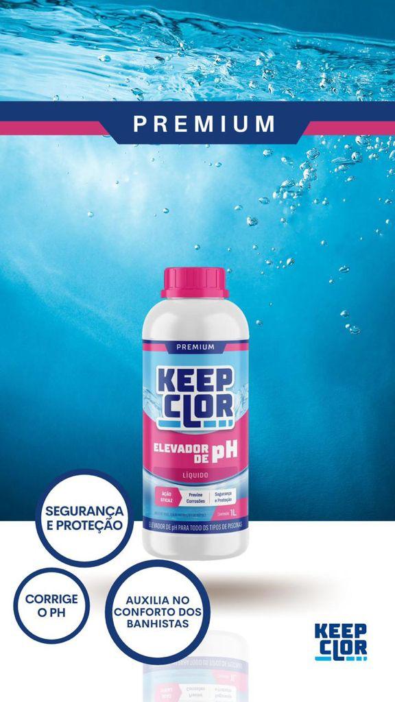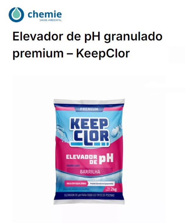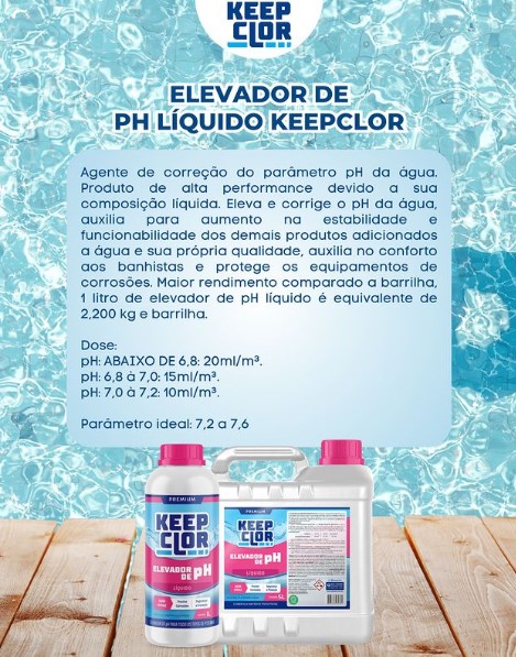 Elevador de pH granulado premium KeepClor corrige o pH da água, mantém uma água balanceada, auxilia no conforto aos banhistas e protege os equipamentos.