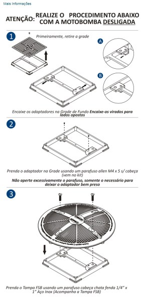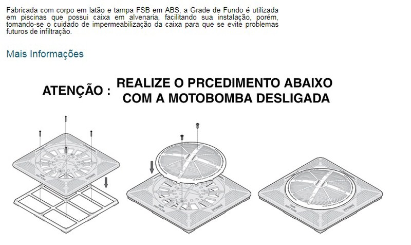 Fabricada com corpo em ABS e tampa FSB em ABS, a Grade de Fundo é utilizada em piscinas em que é feito na própria piscina a caixa em alvenaria, facilitando sua instalação, porém, tomando-se o cuidado de impermeabilização da caixa para que se evite problemas futuros de infiltração. Fornecido em três (03) tamanhos:15 x 15 cm;