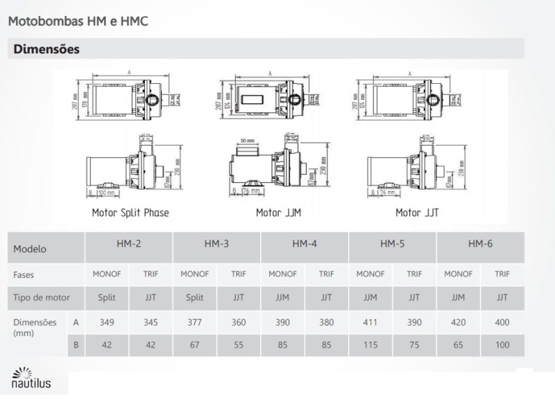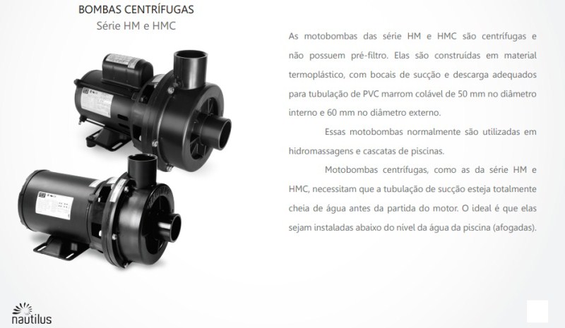 As motobombas para piscinas Nautilus centrífuga da série HM foram projetadas para uso em cascatas decorativas e duchas de hidromassagem, fabricada em plástico de engenharia ABS, são resistentes, silenciosas e à prova de corrosão. Os motores elétricos acoplados são monofásicos com tensão de 127 V ou 220 V, com motor Split Phase ou trifásicos com tensão de 220 V ou 380 V, com motor JJT. A motobomba para piscinas centrífugas Nautilus da série HM- funciona com o motor da linha Premium da Weg que proporciona eficácia e durabilidade, com alto torque de partida e projetado para as condições da rede elétrica, que reduz sensivelmente o risco de trava e queima. Como diferenciais, destaca-se as opções para interligação a tubulações de 50 mm ou 60 mm na sucção e retorno. As motobombas para piscinas centrífuga Nautilus da série HM têm garantia de 01 ano e apoio de assistência técnica, se necessário, além de ser um produto Nautilus que lhe confere confiabilidade de mais de 30 anos de tradição no mercado.