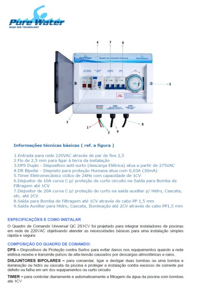 O Quadro de Comando Universal QC 2S1CV foi projetado para integrar instaladores de piscinas em rede de 220VAC objetivando atender as necessidades básicas para uma instalação simples rápida e segura.