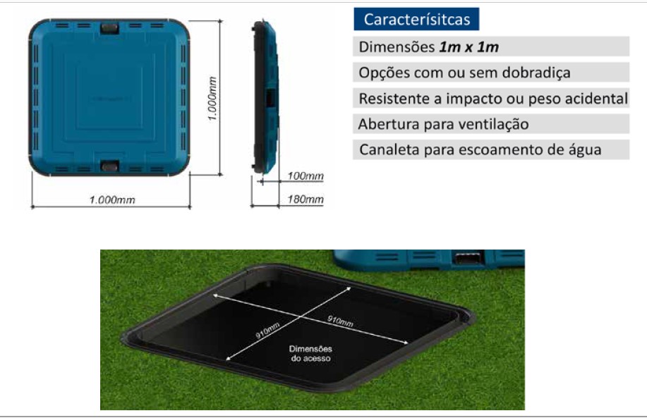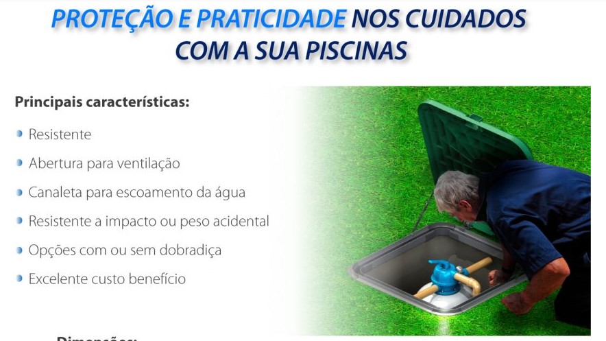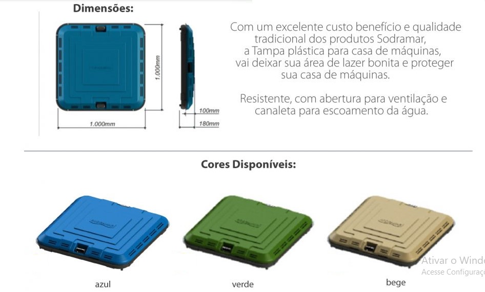 A tampa para casa de máquinas Sodramar, é uma excelente adição para quem deseja proteger sua casa de máquinas com uma tampa resistente e discreta. Disponível nas cores azul, verde e bege para a combinação ideal com a sua Piscina, com ou sem dobradiça, no tamanho 1 m. x 1 m.