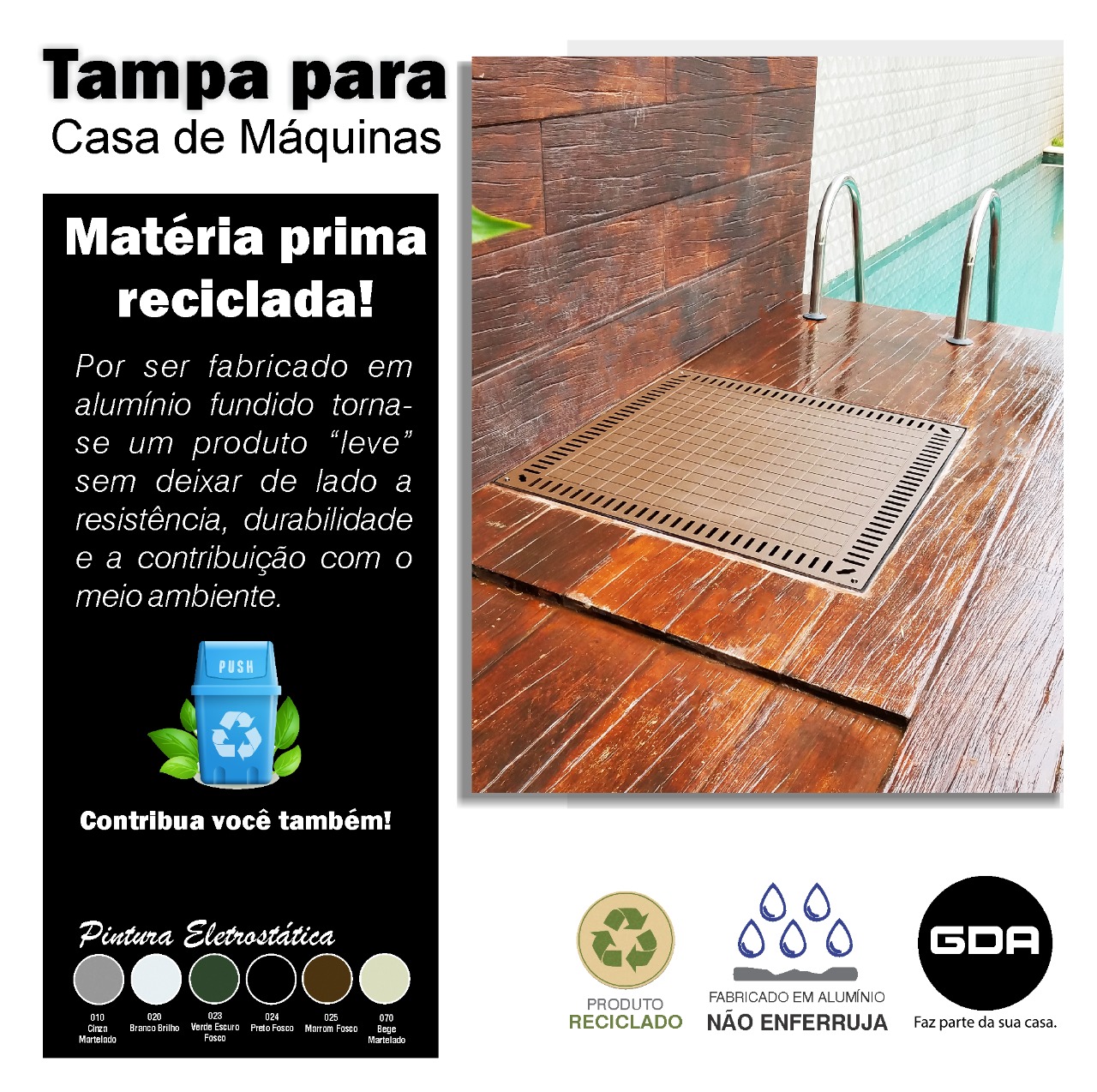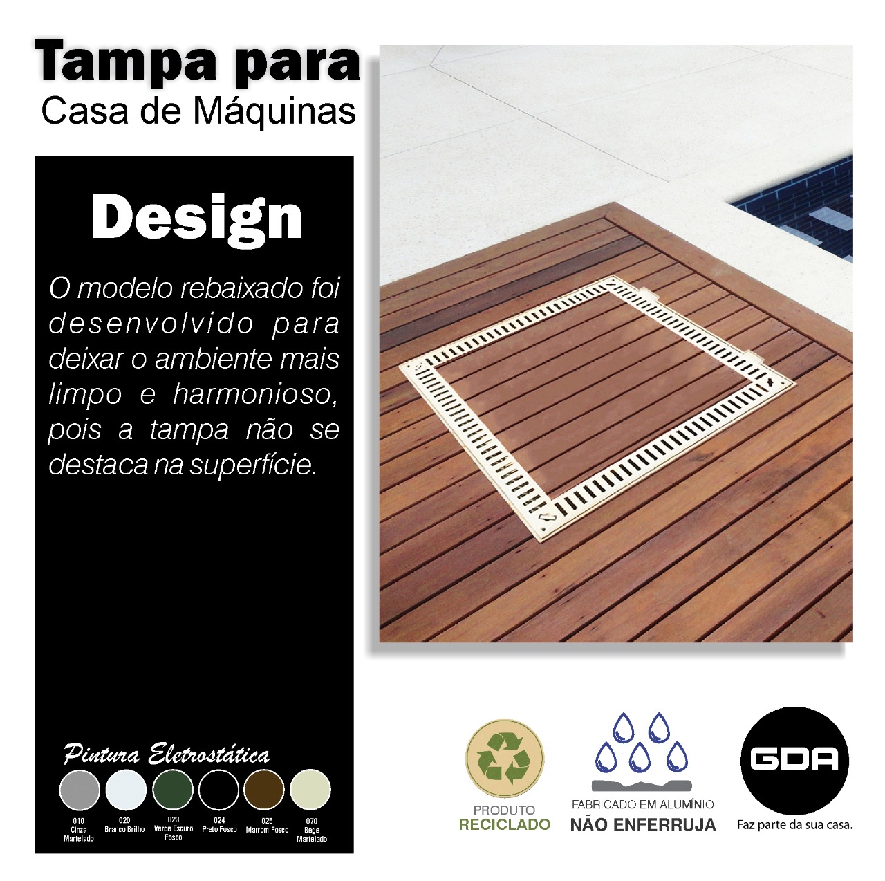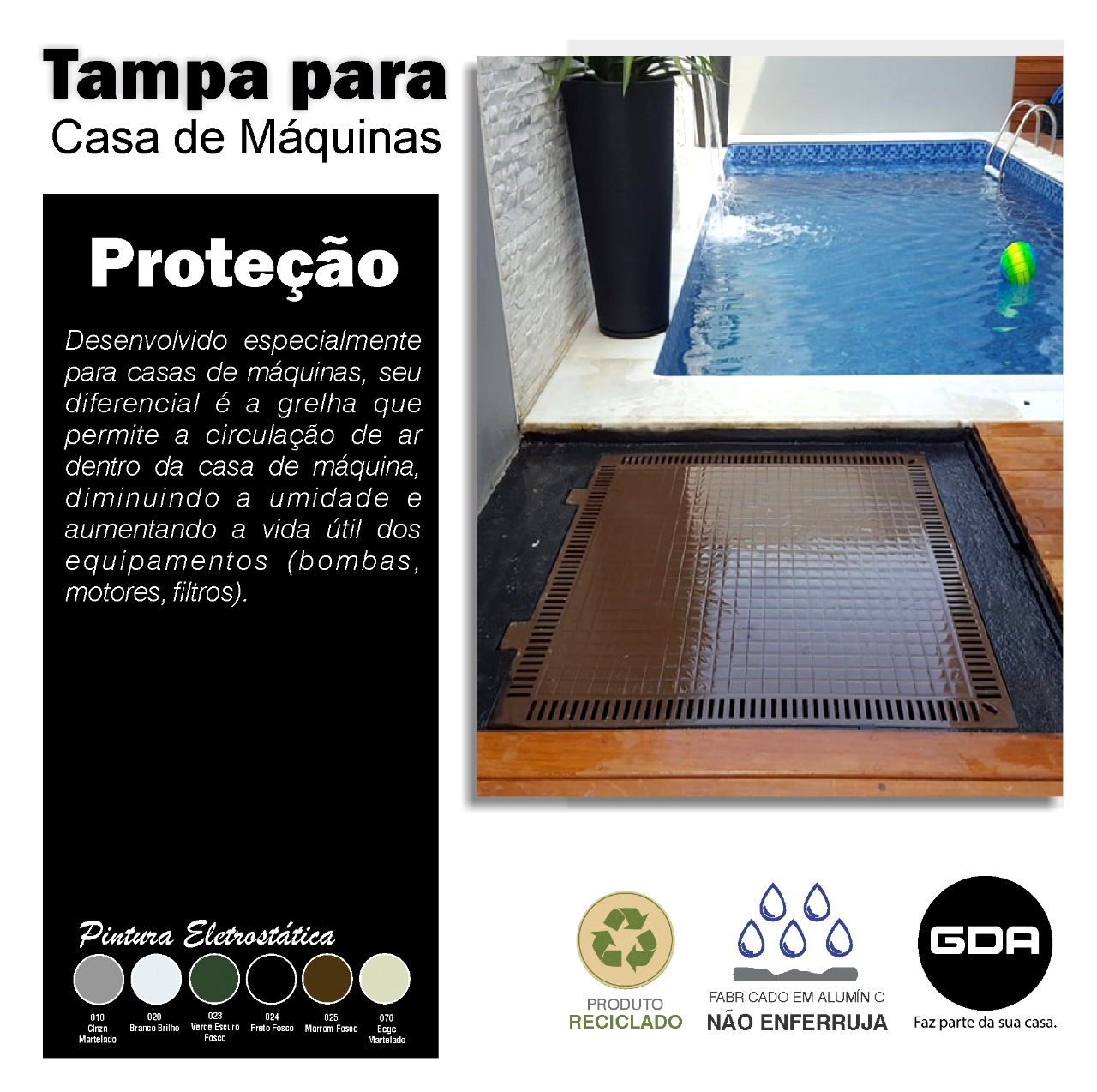 As tampas para casa de máquinas GDA protegem e prolongam a vida útil dos equipamentos, como bombas, motores e filtros de piscina. Feitas de alumínio fundido, são duráveis, resistentes à umidade e fáceis de manusear. Elas evitam danos causados pela umidade, proporcionam uma vedação eficiente e têm um visual agradável. Essas tampas garantem proteção, durabilidade e bom desempenho dos equipamentos.